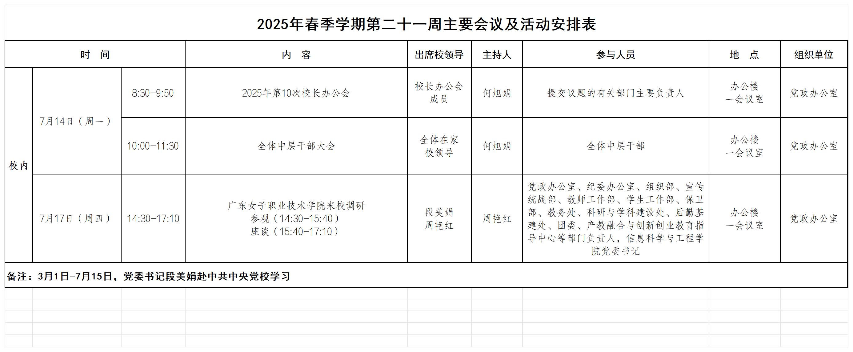 2025年春季学期第二十一周主要会议及活动安排