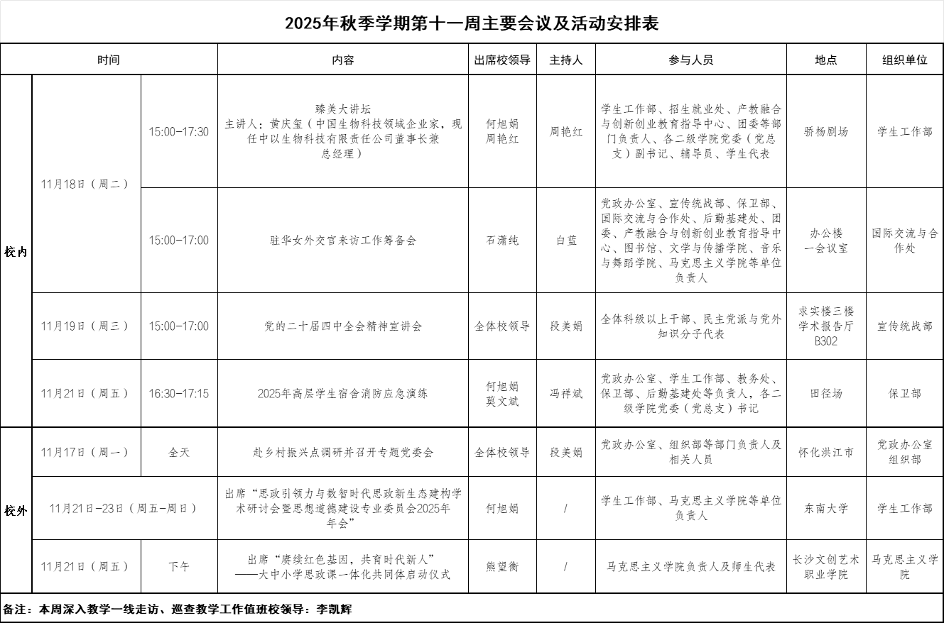 2025年秋季学期第十一周主要会议及活动安排表