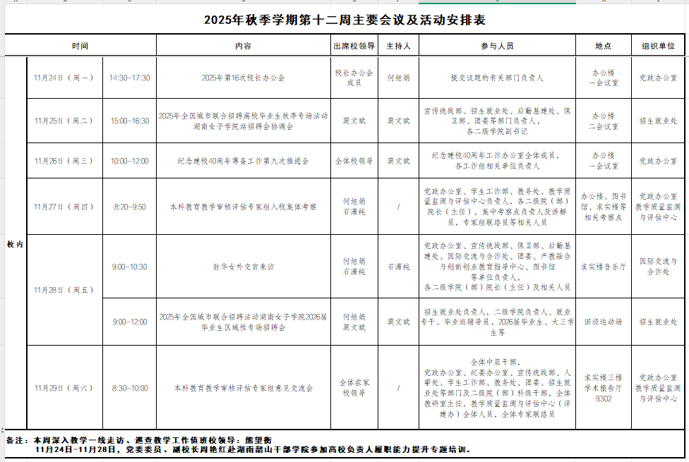2025年秋季学期第十二周主要会议及活动安排表