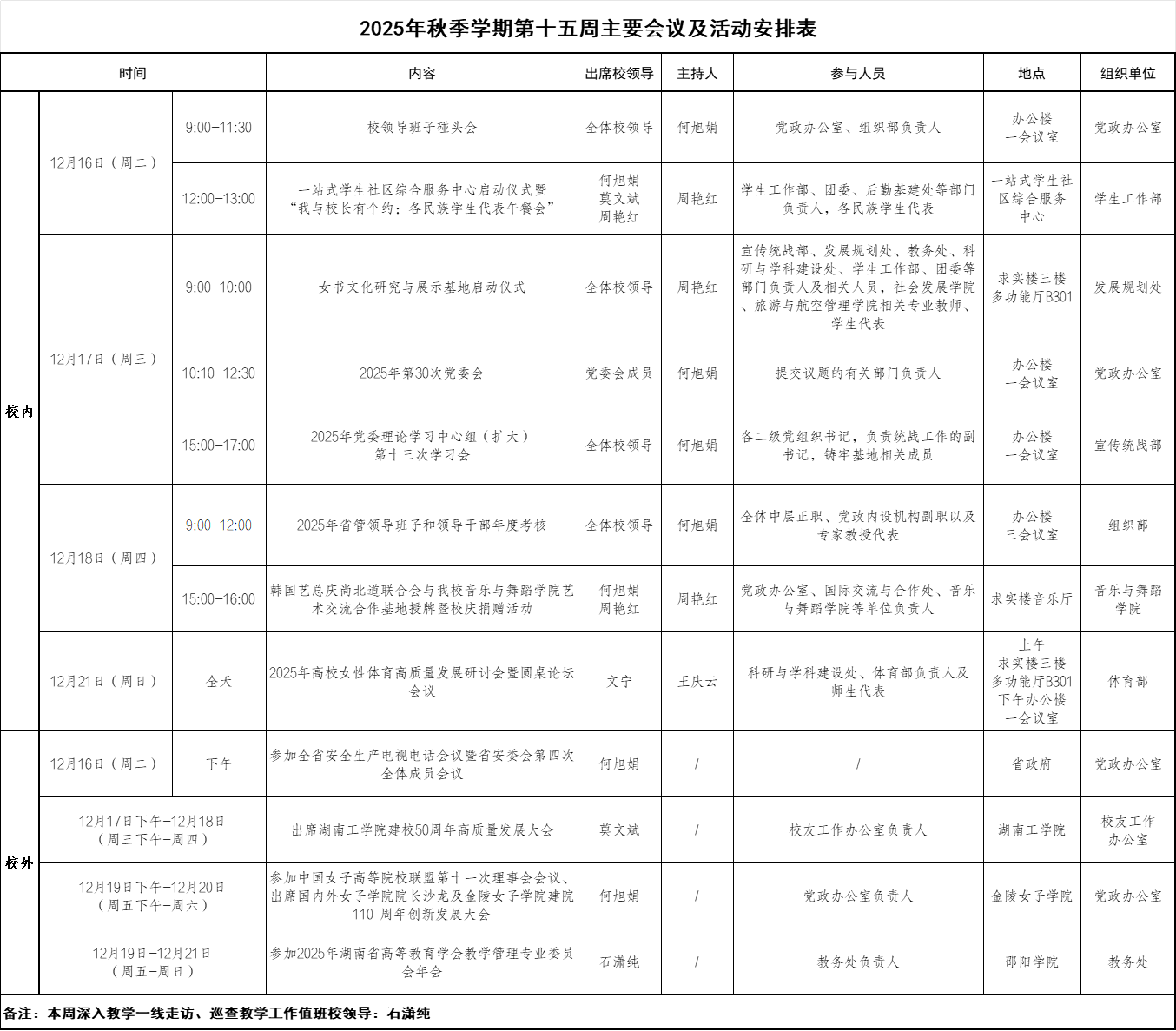 2025年秋季学期第十五周主要会议及活动安排表