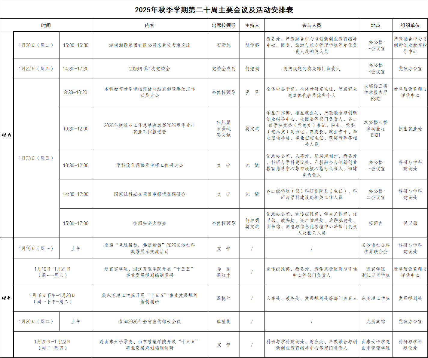 2025年秋季学期第二十周主要会议及活动安排表